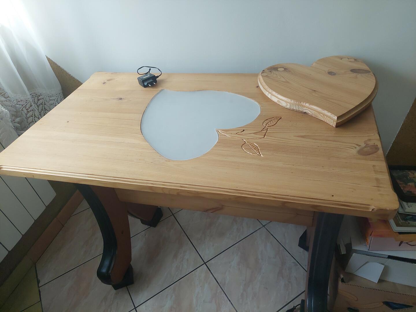 Stół wykonany - blat ozdobna sosna , nogi z drewna afrykańskiego , podświetlenie ledowe w kształcie liścia w to miejsce można włożyć drewniany liść wtedy jest podwyższona podstawka pod coś